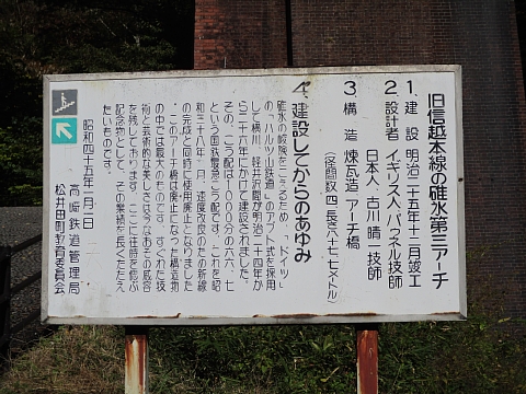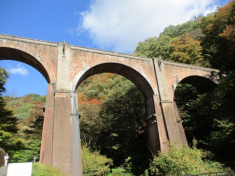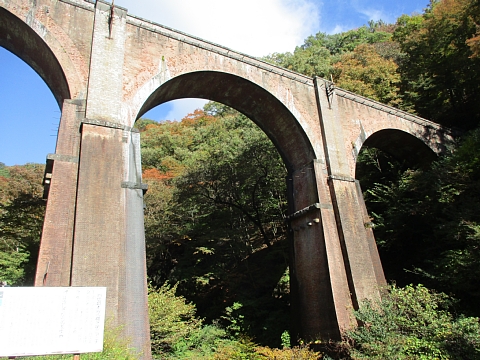 | 「めがね橋」です。明治25年に完成した日本最大級の4連アーチ式鉄道橋だそうです。 | 遊歩道「アプトの道」の一番の見どころで、シンボルです。青空に映えます。 |