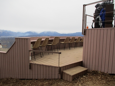 | 山頂から少し下った処におしゃれなテラスがありました。 椅子に座り遠景を眺めながら昼食を摂りました。 |