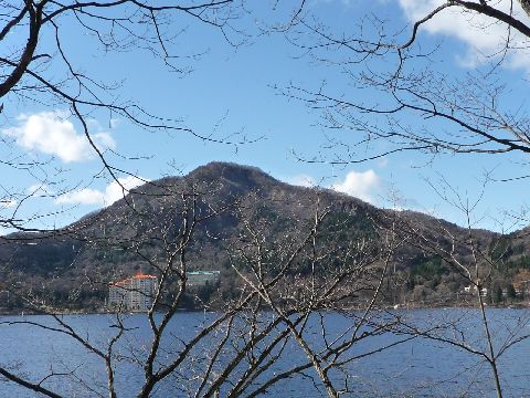| 湖畔からは駐車場まで湖に沿って歩きます。先週のスタートであった掃部ヶ岳の対岸からの遠望です。 | ずっと舗装道路歩きを覚悟していたのですが、湖畔を歩くルートがあり、趣が有ります。 |