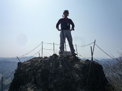 | 午前中の訓練の成果が出たのかおK3、鎖を2本持って登ります。 | おK3遂に岩櫃山頂上に立ちました。あまり下を見ないように。 |