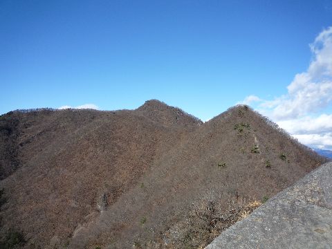 | 頂上へは鎖を使い岩を登るとすぐでした。これが獅子岩のてっぺんの石碑です。遠くからも見ることが出来ます。 | 頂上からの景観1。これから向かう子持山方面です。 各HPでは子持山山頂よりもこの場所の方が景観が良いとのこと。 |