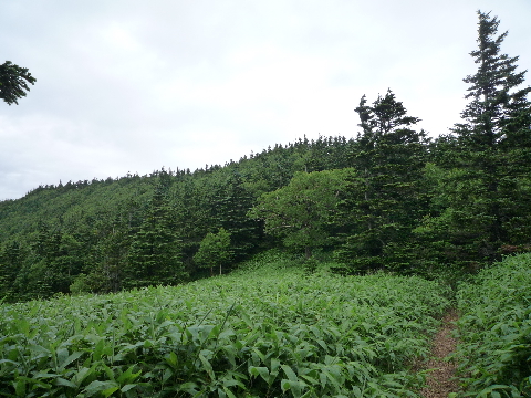 途中から樹林帯となりちょっと急登も有ります。 ここで単独行の下山者に会う。「早いですね」と言うと昨日は車中泊だったそうです。先着3台の内の一人ですね。 |