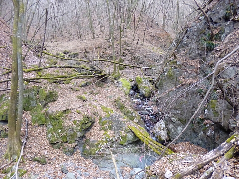 | 植林帯の急峻な下りですのでそのまま補助ロープで楽ちんに降る。 | 林道が見えましたがその手前には堰堤が。降りると這い上がれないかもしれない。少しうろうろしてやはり補助ロープで降りたつ。 |