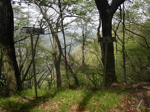 | 鞍部には「三山参道」の標識と奥の院の道標がありました。 |