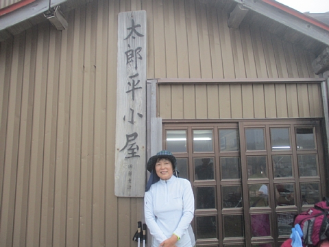 | ほんの一瞬薬師岳が見えました。慌ててシャッターを押しました。 | 雨がパラパラとしてきた中、やっと太郎平小屋に到着しました。 そしてその直後に強雨がザーと降り出しました。間一髪。 |