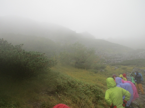 | 「予報では昨日より風が強いので突風が来たらすぐに立ち止まって両足で踏ん張ってください。」とガイドさんからのアドバイス。 意気消沈しながら水晶小屋を出発。もちろん今日も雨具装備です。 |