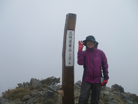 | 黒部五郎岳小舎を出発。今日も朝から雨具装備です。 | 「三俣蓮華岳」頂上です。 |