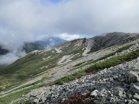 | 草もみじも綺麗です。 | なんと「槍ヶ岳」が雲の間から。慌ててパチリ。本来ならば沢山の登った山々を回顧しながら「裏銀座」を楽しめのになと少し残念な気持ちに。 |
