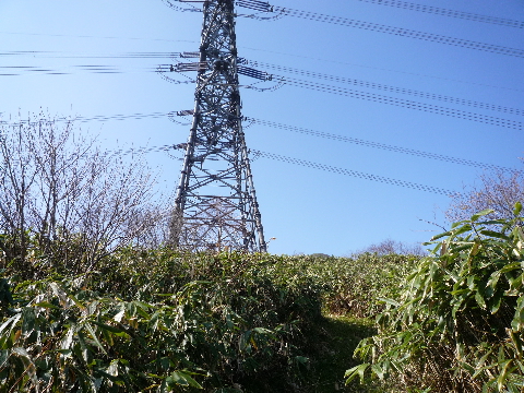 | ここは左に分岐なのですが、まっすぐに行っちゃいそうですね。この先で今日始めて単独行の男性※に出会う。先客の車の持ち主でした。 | 大鉄塔が見えてきました。 ここで休憩します。 |