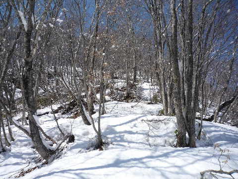 | 岩場の大きなツララが気温の低さを物語っておりますが、登山中は汗だくなのであまり寒さは感じません。 | 岩場を抜けました。雪はますます深くなり、踏み抜くと膝までズッポリと行ってしまいます。 |