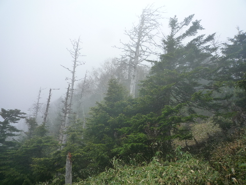 途中枯木の目立つ風景が目に飛び込んできました。 コルからはほとんど急な登りもなく良く踏み込まれた道を辿ります。 |