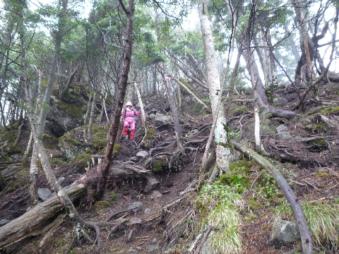| 段々と急になってきまして、おまけに岩場に出くわしました。 巻き道は有りません。登るっきゃない。 |