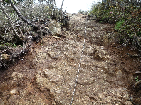 | 鋸山の頂上が近くなるにつれ急登がきつくなります。 | 脆い岩の急斜面はロープに頼らざるを得ません。雨で足下が滑ります。 |