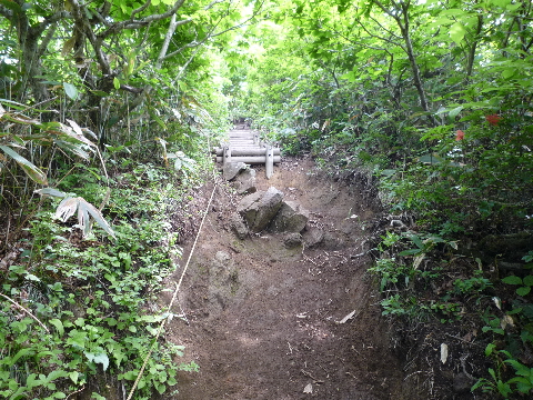 | 途中に綺麗な花が。タニウツギという花です。 | 松手山へはひたすら登る、ただひたすらに。ロープあり、木道あり。 |