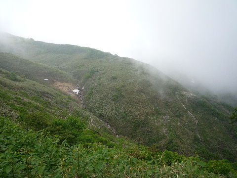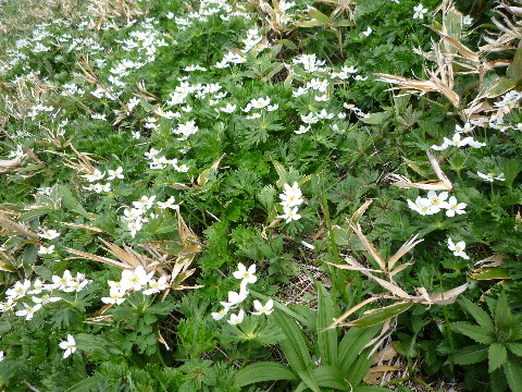| ハクサンイチゲの群落です。高価そうなカメラで登山道の側にある高山植物の写真を撮っている人が何人もいたなぁ。 | 花を眺めながら登ると山頂に到着です。眺望は残念ながら・・まるで雲の中ですので。山頂は人だらけなのですぐに仙ノ倉山に向かいます。 |