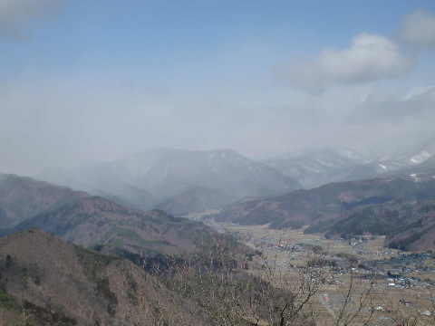 | 昨日登った迦葉山ですが、今日は吹雪いているようです。 あの頂上からはこの山が良く見えました。 |