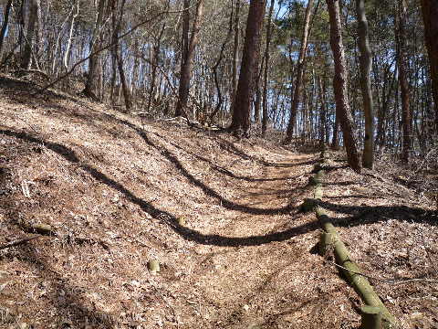 | 戻りは小薮を避けて途中の鞍部から西に降りて林道に出る事にしました。 | 斜面から林道に出た所です。 |