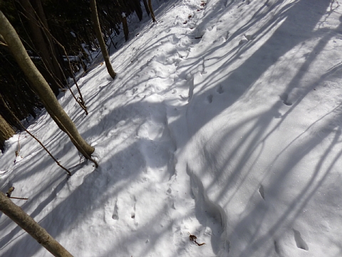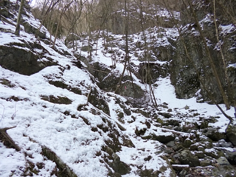 | 鳴神山登山道の最初から積雪が少々。 | 沢の様子。 |