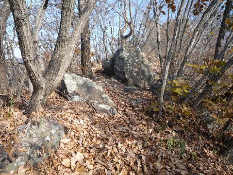 | 吾妻山も登るにつれて葉が落ちてしまい、初冬のたたずまいです。 | この岩が見えると頂上です。 |