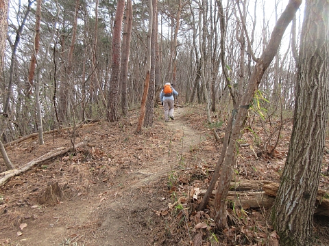 | 登山口の赤城神社。裏手が登山口。 | 完全に葉の落ちた木々の中。なだらかな登りです。 |
