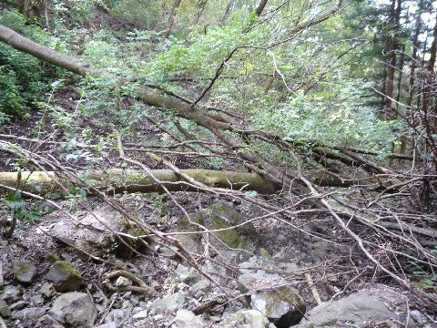 | 後は前回のルートを下るだけです。見覚えのある場所ですね。 | 駐車場所までの戻り道ですが、1カ所だけ画像の様に樹木が半分倒れかけて道路に覆い被さって居ますので、車両は入って来れそうにありません。 |