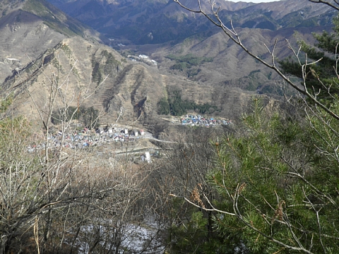 | 石垣山に着いたようだ。振り返って備前楯山からの下ってきた尾根を眺める。ほほーう、あそこをくだってきたのね。自分で感心する。 | 間藤の町並みが箱庭の様に見える。 |