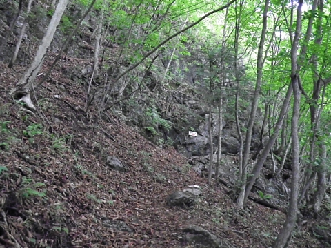 | 股峠の北側の駐車場まで来ればこの1時間弱の登りは大幅に割愛できるが、周回コースを取るためには坂本登山口でなくてはならない。 | ローソク岩への分岐。 クライマーさん達が行く場所です。 |