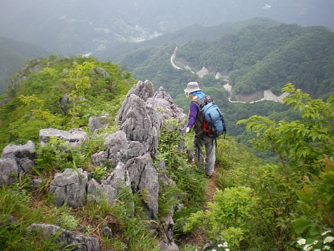 おK3に自分のやった手順通りに渡る様に云うと案外すんなりと通過できた。 しかしこの難所の通過は怖かったと正直に白状していた。 この後も細い足場の右側がすっぱりと切れている場所は慎重に渡った。 それ以外はちょっと急な岩場の尾根歩きである。 |