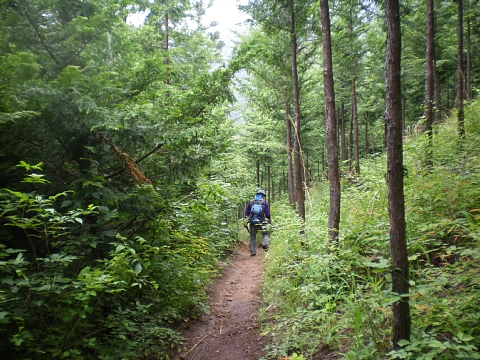 | 最初は植林地の登山道で、昨日の降雨の為かかなり湿っていた。 | 登山道には倒木もあったりする。 「どうやって越えようかしらね」と算段するおK3であった。 |