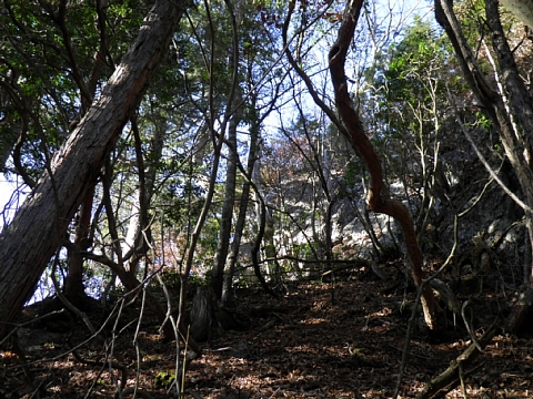 | 馬道のコルまで戻りました。行きも帰りも1度ずつ道間違えしてしまい何か精神的に疲れたので天丸山はパス。 | 木々はほとんど葉を落としてしまい、初冬の雰囲気。 1日中陽の当たらない場所では霜が融けず残っていて白くなっている。 |