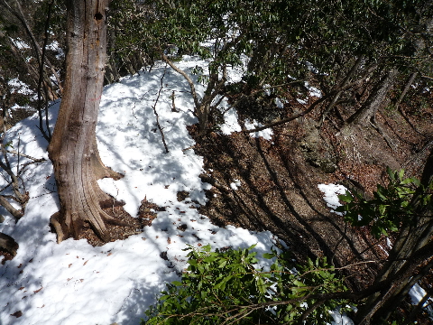 | 檜の植林地に入ると又雪が。 | ジグザグ路を降りるだけなのでこのまま行っちゃえ。 |
