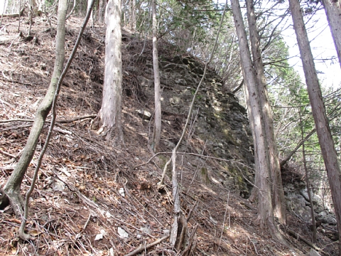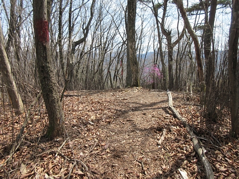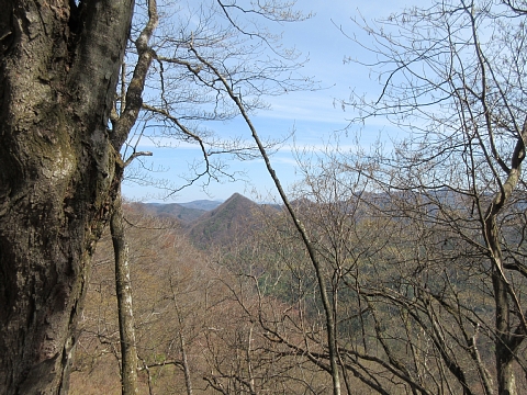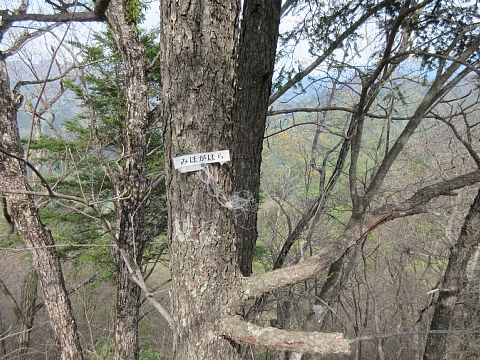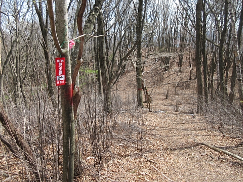 | やたら目印の多い場所に出くわしたのだが、たぶんここが余地峠への入口と思われる。 | 樹間から見えるピラミダルな鋭鋒は小唐沢山。 隣の霊仙岳と合わせて歩かれているようだ。 |