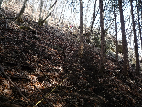 | とにかく山頂直下の下山時はこのロープはありがたい。 | 帝釈岩方面への隣の峰へ渡る場所を見逃さないようにして急斜面を木に掴まりながら下る。 |