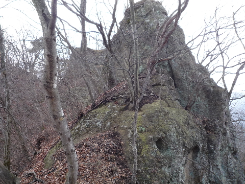 風も無い穏やかな日溜まりの山頂であるが、気温は低い。 この時期以外は木々の葉で覆われ眺望はあまり期待できないのでは無いだろうか。 12時前に着いてしまったので、ゆっくりと食事をした。 12時を少し回った所でそろそろ下山しましょうかね。 このまま戻るのでは早すぎるので少し寄り道して帝釈岩方面の「ジジ岩ババ岩の展望が良い」とガイドに書いてある場所に行ってみることにする。 |