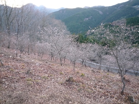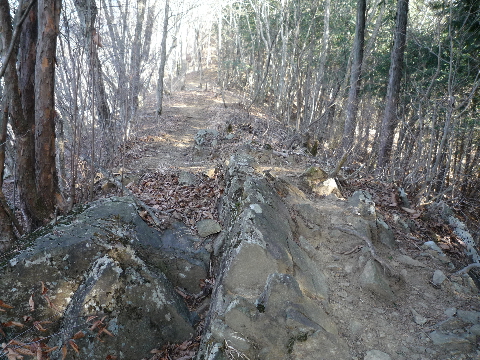 | このお二人は早脚で、先に山頂をたった我々を途中で「お先に失礼」と言うことですいすい先に行っちゃいます。林道が見えてきました。 | おK3も最後の枯れ葉に埋もれた斜面を慎重に降りてきて東御荷鉾山もおしまい。 後はスーパー林道を駐車まで歩くだけです。 |