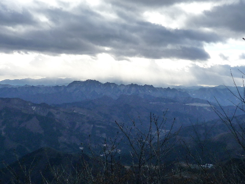 山頂から見る両神山方面。ここで休憩しているとオドケからの先行者のお二人がやってきた。駐車位置からてっきり西御荷鉾山で戻るものと思っていたのでちょっと驚いた。「林道歩きが長いですよね」「そうなんですよ」等と会話を交わす。我々はそれほど長くもない。 |
