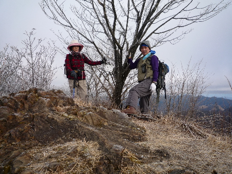 樹間からは雄大な真っ白な浅間山が見えたのですが、写真に撮るとうまく写りません。 残念です。 誰も来ない山頂で我らとしては比較的長い時間を過ごします。 何とか木の枝にカメラを乗せてセルフ撮影を試みたりしたのですが、うまくいきません。 今後の事も有るので一脚兼用のストックでも検討してみましょうかね。 |
