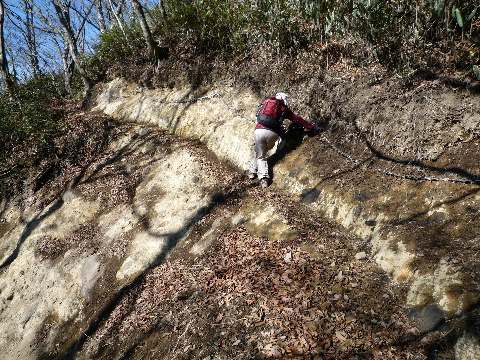| 矢川峠ですが、直進ルートは崩落しているようで左に巻き道があります。 | 八風山の直前のピークを巻く所に鎖が設置してありました。 ここが通行止めの原因となる崩落場所の様です。 |