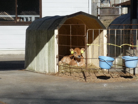 | なだらかな斜面をゆっくり降りてくると牧場の建物が見えてきました。 | 子牛がひなたぼっこしているのどかな風景です。 |
