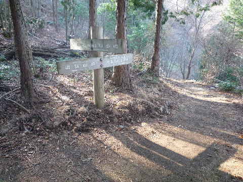 尾根コースと谷コースの分岐。登りは尾根コースを採るので左へ。 |