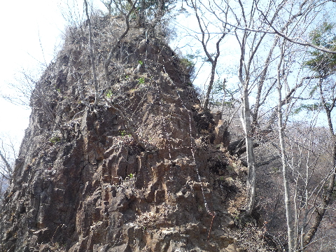 | 2本の鎖を持って登ってみれば、足場がしっかりしていて見た目ほどでは有りません。手抜きを考えないで最初からそうしなさいよ。 | 後ろを振り返ると西立岩と東立岩が。 今回は東立岩へも寄りたかったが、踏み跡が薄かったのでパスです。 |