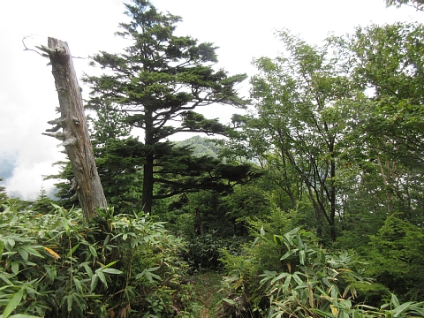 | 頂上からの展望。横手山が少し雲に隠れている。 | 少し戻って目印テープに場所に分け入ると刈り払われた登山道です。 |