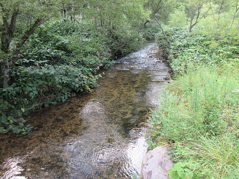 | 70m沢登りの標柱。 | 水量のほとんどない沢です。 |