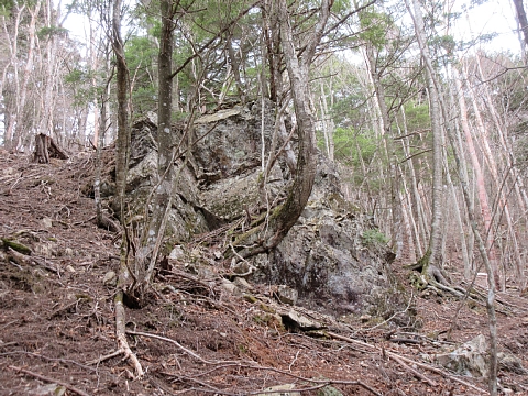 | 大きな岩が見えてきました。しかし踏み跡は無いなぁ。 | ちょっと傾斜がきつくなっているけど雪が無いからいいか。 |