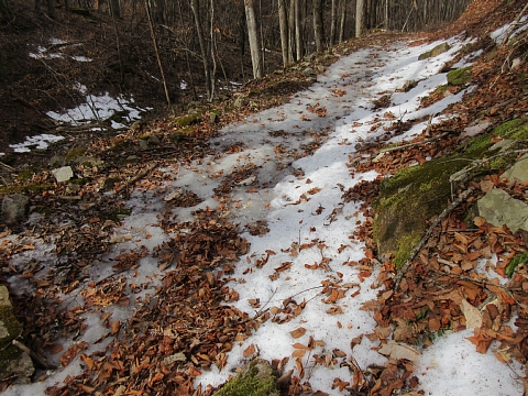 | 上から見ると踏み跡に枯れ葉が溜まりわかりやすい。 | そこそこ傾斜もあるのでゆっくりと降りましょ。 |