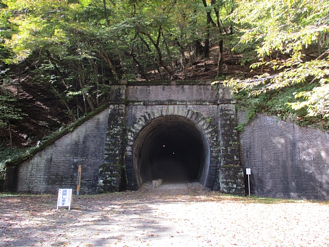 | 「めがね橋」です。明治25年に完成した日本最大級の4連アーチ式鉄道橋だそうです。 | 遊歩道「アプトの道」の一番の見どころで、シンボルです。青空に映えます。 |