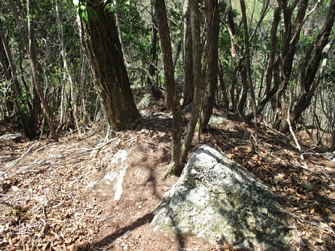 | 沢からか尾根からかと迷った結果、尾根に取り付きました。 | 大きな岩が数か所あり、両手両足を駆使して登りました。 |