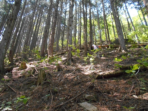 最初の内は植林地内の比較的なだらかな斜面の登りであった。 |