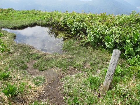 | キスゲ小沼のすぐ上には五葉の泉。 | 大倉山頂上直下の登りは笹原。笹原の下に踏み跡はくっきり。 |