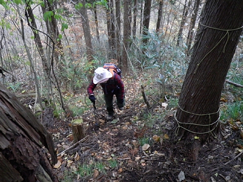 | 赤松の黄葉もまた良し。途中で先客2名に抜かれる。彼らは早い早い。 | 急登だった場所の下りは滑るので補助ロープを使ってみた。 |